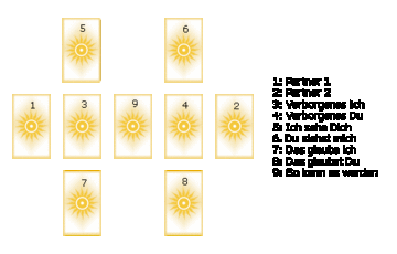 Diese Legeart wird vor allem für Fragen zu Partnerschaft, Freundschaft oder das Verhältnis zu Kollegen verwendet. Sind beide Partner anwesend, zieht jeder nach dem Mischen verdeckt eine Karte und legt sie verdeckt auf die Positionen 1 und 2 (siehe Abbildung). Nach erneutem Mischen hebt der erste Partner ab und legt den unteren Stapel auf den oberen. Die jetzt oben liegende Karte nimmt er verdeckt auf und legt sie verdeckt auf Position 3. Nach abermaligem Mischen verfährt der zweite Partner wie der erste und legt die oben liegende Karte verdeckt auf Position 4. Nach nochmaligem Mischen legt der erste Partner die restlichen Karten wie in der Abbildung aus. Ist nur einer der beiden Partner anwesend, übernimmt dieser beide Rollen.